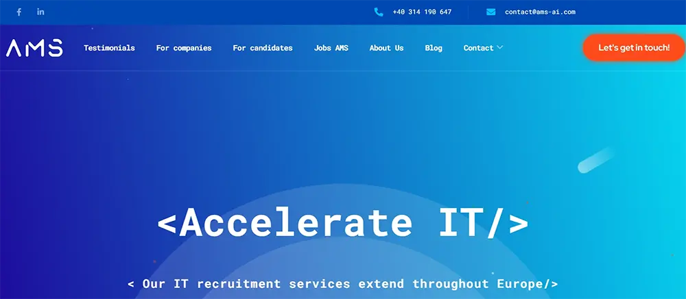 AMS Accelerate IT focuses exclusively on the tech and digital talent market. Their strength lies in sourcing developers, data scientists, and engineers for both startups and established companies. The agency’s modern approach and speed of delivery make it one of the most effective IT recruiters in Romania.